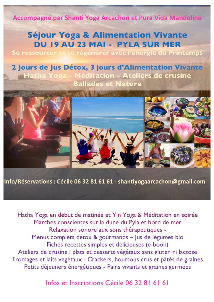 J’aurai le plaisir de vous guider pour des cours de hatha yoga (tous niveaux débutant.e.s bienvenu.e.s) en début de journée et des séances de yoga restauratif, méditation et bain sonore d’instruments de musique thérapeutiques en soirée. Sœur de cœur, Véronique Pura Vida par Mandoline, chef vegan spécialiste de l’alimentation vivante et de la crusine vous fera découvrir et déguster une alimentation saine, gouteuse et savoureuse.