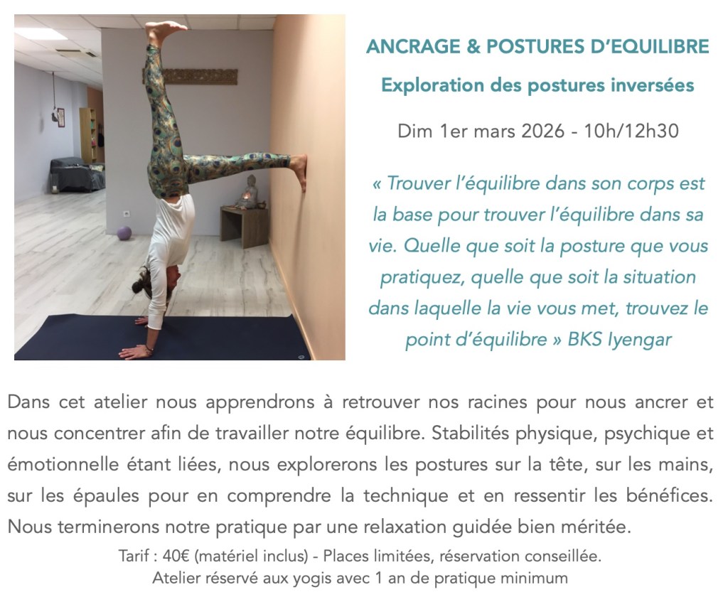 Les postures inversées comptent parmi les asanas les plus bénéfiques et leur pratique régulière permet d’éliminer les toxines, de renforcer le système immunitaire, de calmer le système nerveux. Ils apportent paix, force et vigueur. Cet atelier est entièrement dédié à la compréhension de ces postures sur la tête mais aussi sur les épaules, les bras et les mains. Alors si tu as envie de te tester, de t’améliorer et même de les réussir, inscris-toi!